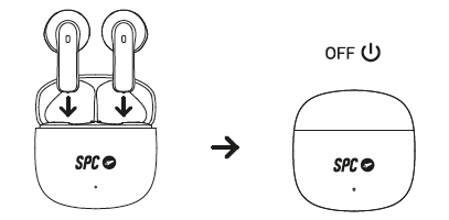 Für ausschalten Bewahren Sie Ihr SPC ZION 2 PLAY bei geschlossenem Deckel direkt im Ladeetui auf. Sie trennen sich vom Bluetooth-Gerät, schalten sich aus und beginnen mit dem Laden.