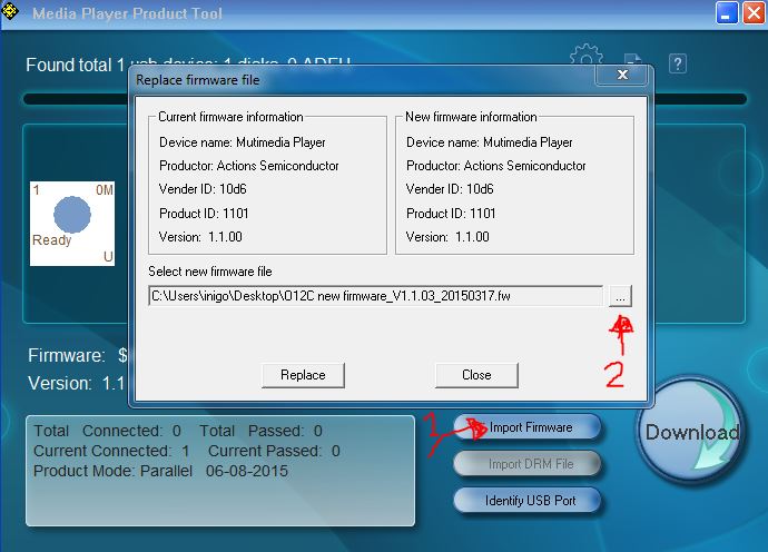 5. Wählen Sie „Firmware importieren“ und durchsuchen Sie dann den Desktop nach der zu ladenden Firmware-Datei, indem Sie die Taste „…“ drücken. . Drücken Sie „Ersetzen“.