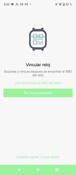 - Anschließend erscheint ein Bildschirm, der angibt, wie Sie den mit der IMEI der Uhr verknüpften Code finden, der zum Verknüpfen erforderlich ist. Sobald der QR-Code der Uhr angezeigt wird, wählen Sie „Gefunden“. Die Kamera öffnet sich, um ihn zu scannen. Wenn der QR nicht erkannt wird, besteht die Möglichkeit, den Code manuell einzugeben. Es handelt sich um einen Code aus 10 Ziffern und Zeichen.