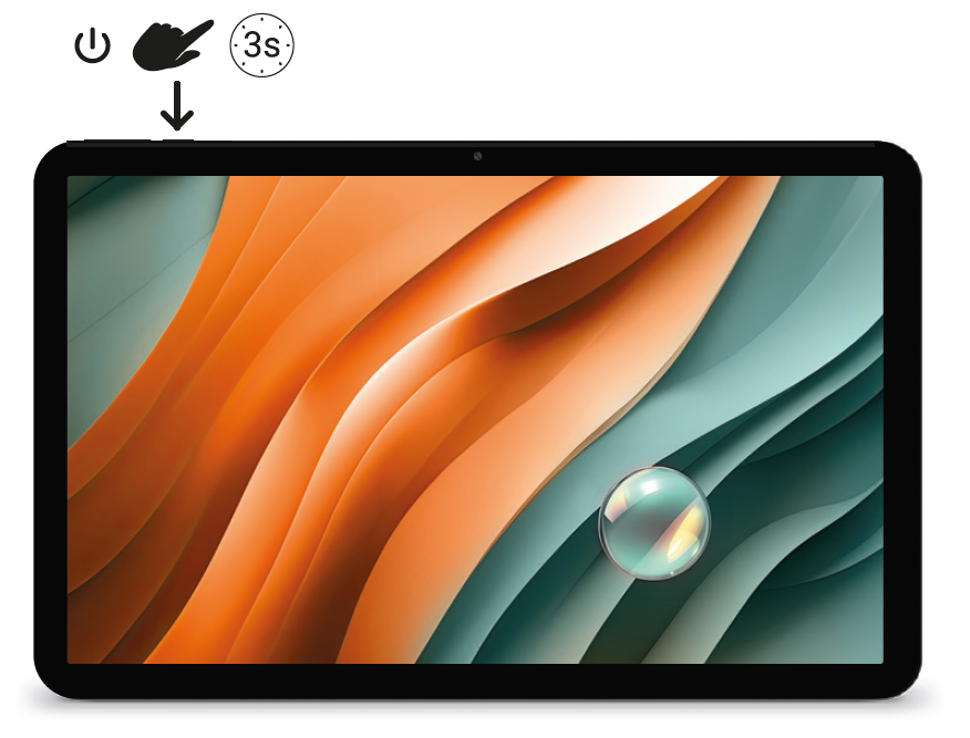 Um Ihr GRAVITY 5 PRO einzuschalten, halten Sie bitte die Ein-/Aus-Taste oben rechts am Tablet 3 Sekunden lang gedrückt.