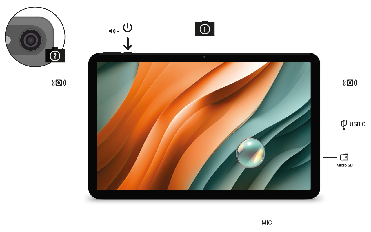 Ihr GRAVITY 5 PRO verfügt über eine Vielzahl an Anschlüssen und Zubehör: 2 Kameras, eine davon mit Blitz, Lautsprecher, Mikrofon, einen Steckplatz für Micro-SD-Speicherkarten und Lautstärkeregler. Im Bild unten können Sie den Standort aller überprüfen: