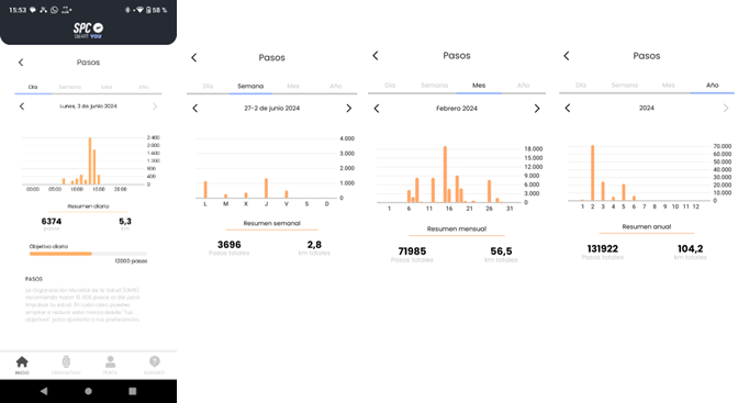 Die Karte “Schritte” zeigt dir im Detail die Schritte, die du über einen bestimmten Zeitraum gemacht hast: Verteilung der Schritte nach Stunden-/Tages-/Wochen-/Monats-/Jahresbereich, mit der Zusammenfassung der gemachten Schritte und ihrer entsprechenden Entfernung.