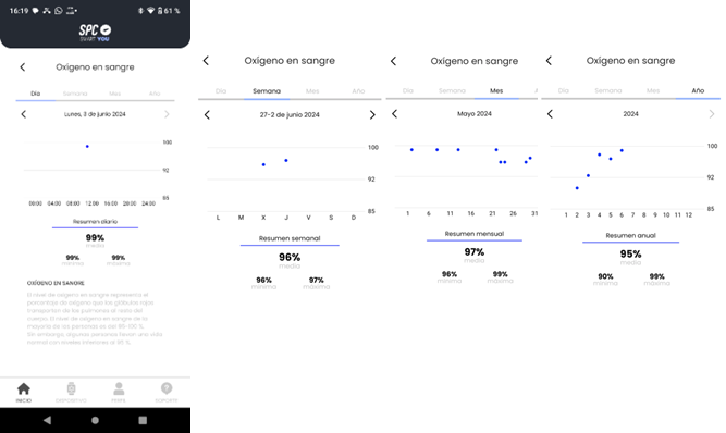 Du kannst die Details der Blutsauerstoffmessungen für den gewünschten Zeitraum anzeigen, nach täglichem/wochen-/monatlichem/jährlichem Bereich, mit der entsprechenden Zusammenfassung für jeden Bereich: Durchschnittswert, Minimal- und Maximalwert und entsprechende Grafik: