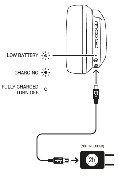 Wenn der Akku leer ist, verbinden Sie die Kopfhörer mit dem im Lieferumfang enthaltenen Ladekabel mit einem 2A- und 5V-USB-Netzteil für ca. 2 Stunden.