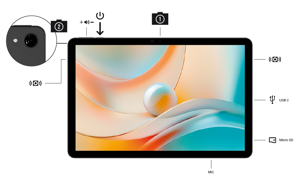 Dein SPC GRAVITY verfügt über zahlreiche Anschlüsse und Zubehörteile: 2 Kameras, eine davon mit Blitz, Lautsprecher, Mikrofon, einen Steckplatz für MicroSD-Speicherkarten und Lautstärkeregler. Im Bild unten siehst du die genaue Position aller Elemente: