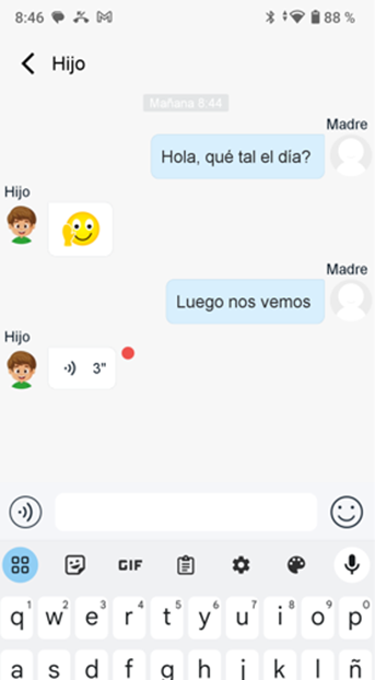 In der App kannst du Textnachrichten und Emojis über die Tastatur versenden oder Sprachnachrichten senden, indem du die untere Taste gedrückt hältst: