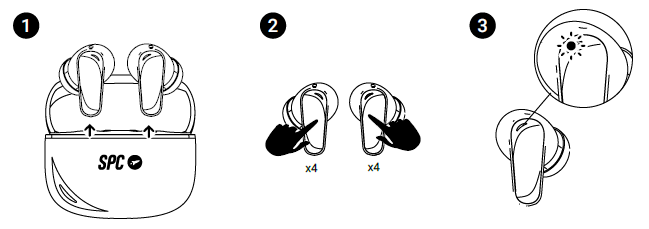 - Nimm beide Kopfhörer aus dem Ladeetui, drücke dann 4 Mal gleichzeitig auf das Touch-Bedienfeld beider Kopfhörer.