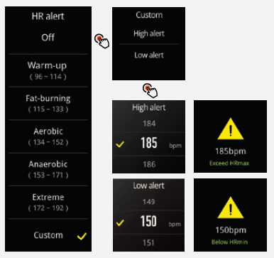 Wenn die Herzfrequenz hoch/niedrig eingestellt ist, vibriert die Uhr, um Sie zu benachrichtigen.