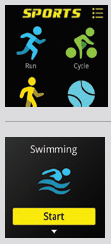 Für umkehren, wischen Sie auf einem beliebigen Bildschirm nach rechts. Das folgende Beispiel zeigt, wie Sie von einer bestimmten Sportart (in diesem Fall Laufen) zum Hauptsportmenü zurückkehren.