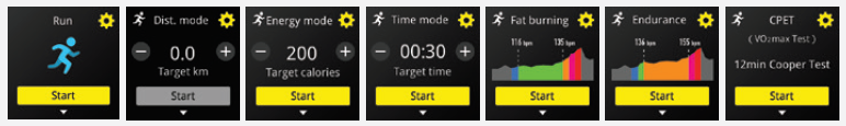 Beim Zugriff auf eine Sportart wird zuerst der zuletzt verwendete Modus angezeigt. Wenn Sie beispielsweise bei der letzten Auswahl des Laufmodus den Cooper-Test durchgeführt haben, wird dieser zuerst angezeigt.