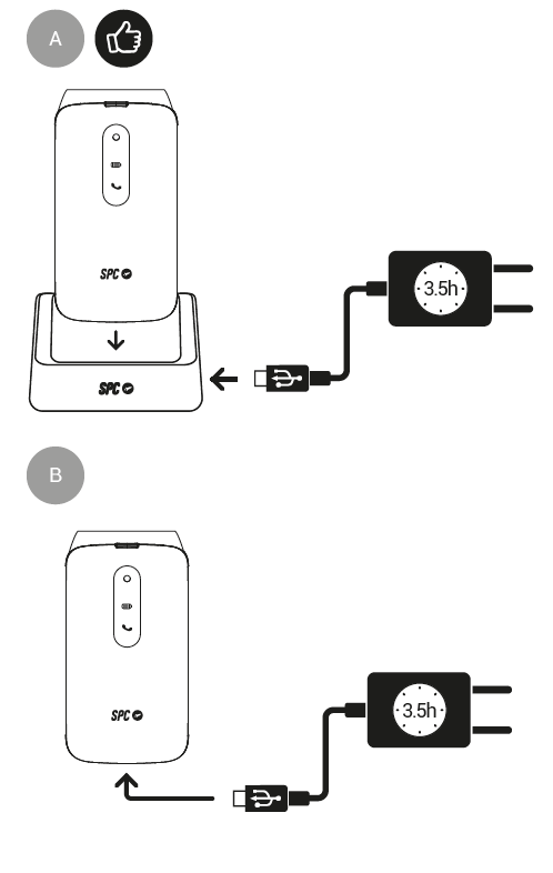 Schließe das mitgelieferte Netzteil an eine beliebige Steckdose in deinem Haus an. Verbinde das andere Ende des Ladegeräts (B) mit dem Ladeanschluss des Telefons oder (A) mit der Ladestation (empfohlen), um den Akku aufzuladen.