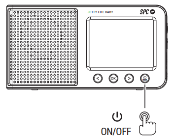 Drücke kurz die Taste POWER/MODE, um dein JETTY LITE DAB+ einzuschalten. Auf dem Bildschirm erscheint die Meldung „Welcome“ und anschließend wird der letzte Modus angezeigt, der beim Ausschalten aktiv war.