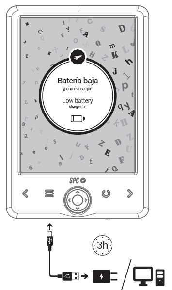 Ihr DICKENS LIGHT 2 verfügt über einen internen Akku. Bevor Sie es verwenden, müssen Sie es mit einem Ladegerät aufladen. Wir empfehlen Ihnen dazu, das USB-Kabel zu verwenden, das Sie im mitgelieferten Zubehör finden, und es an einen PC oder Mac oder über ein USB-Ladegerät für Ihr Mobiltelefon oder Tablet (nicht im Lieferumfang enthalten) an das Stromnetz anzuschließen. Es spielt keine Rolle, ob das DICKENS LIGHT 2 ein- oder ausgeschaltet ist, sobald es angeschlossen ist, schaltet sich der Bildschirm ein und der Ladevorgang beginnt.