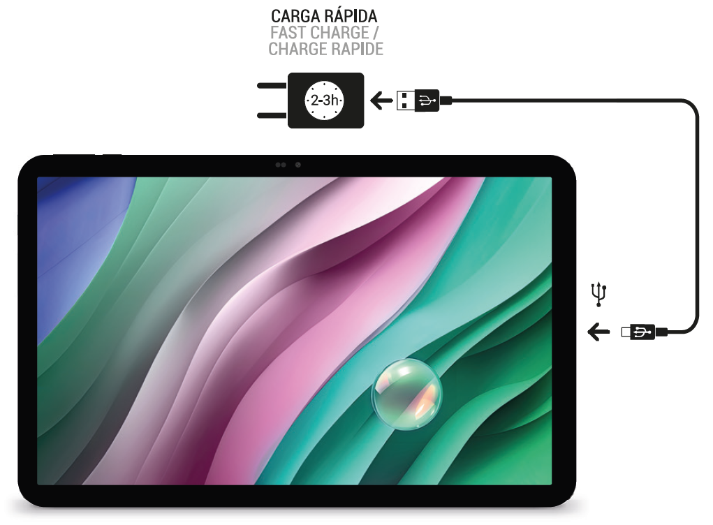 Sometimes, if the battery is very low, it may take from several minutes to 2 hours after connecting the charger to the power outlet for your tablet to start charging. Don't worry, as after this time, the battery will reach the minimum battery level for booting.