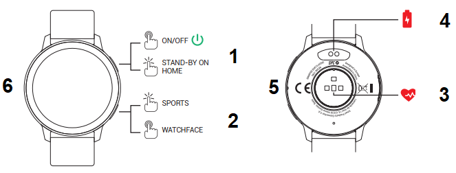 Long press turns the watch on and off. Once on, a short press turns the screen on or off. In a menu, press briefly to exit the menu and return to the home screen or to pause/resume the sport you are doing.