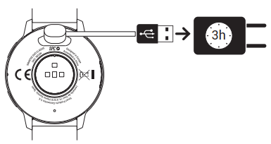 Before turning on your watch for the first time, it is advisable to fully charge the battery. To do this, connect the charging cable to the back of the device and the USB connector to a USB charging port.