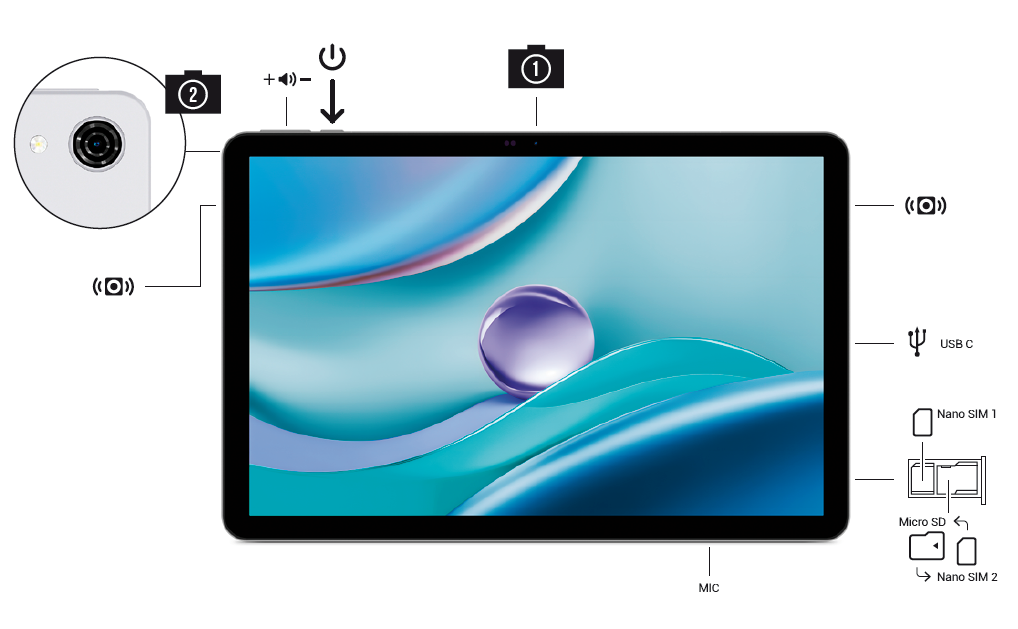 Your SPC GRAVITY PRO features a variety of connections and accessories: 2 cameras, one of them with flash, speakers, microphone, a slot where you can insert 2 SIM cards or one SIM card and a Micro SD memory card, and volume controls. In the image below, you can check where each of them is located: