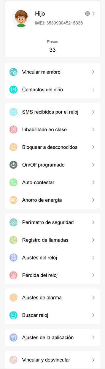 Contains the basic watch and child information: Name, photo, IMEI, watch phone number, QR code of the watch, firmware version, gender, birthday, and school grade: