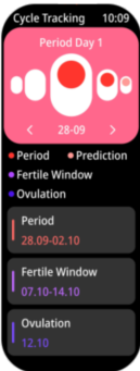 Once configured, you can see on the watch and in the application the prediction of the period, fertile window, and ovulation.