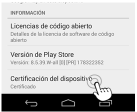Para comprobarlo, abre tu App "Google Play" y despliega el menú lateral. Ve a Ajustes y deslizando hasta abajo, llegarás a un apartado que indica la "Certificación del dispositivo", donde te indicará si está certificado o no.