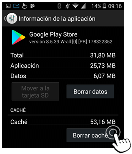 3. Limpiar la caché de "Servicios de Play Store": en tu dispositivo móvil deberás ir a Ajustes, después a Aplicaciones y seleccionar la App "Servicios de Google Play". En el área de caché, pulsar sobre "Borrar caché".