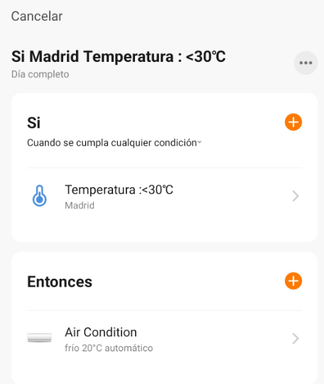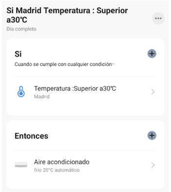 Ej: Si la temperatura de Madrid es superior a 30º, enciende el aire acondicionado a 20º en modo Frío, Velocidad automática.