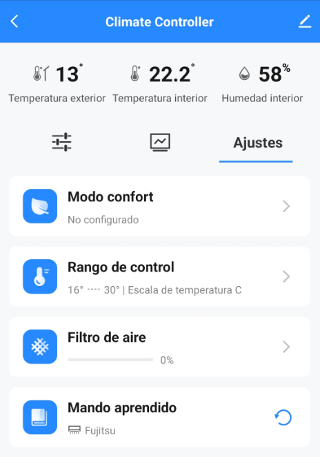 Una vez entramos en la pantalla del termostato en la parte media-superior aparecerán tres opciones. Por defecto estamos en “Controles”, tendremos que pulsar en “Ajustes”. En esa pestaña hay cuatro categorías: