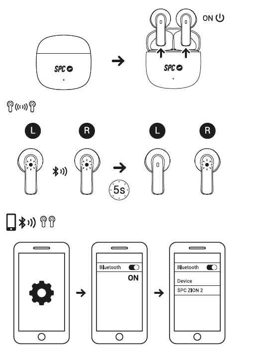 Para realizar una primera conexión al SPC ZION 2 vía Bluetooth, tendrás que activar la conexión Bluetooth en tu dispositivo. Una vez activada dicha conexión, tendrás que buscar tus ZION 2 en el listado de dispositivos Bluetooth detectados. Una vez seleccionado, los auriculares emitirán un sonido de conexión establecida.