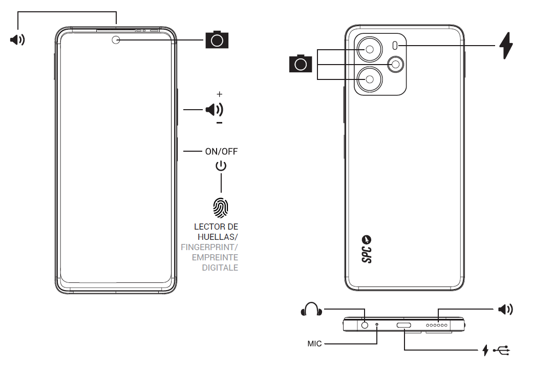 Tu SPC DISCOVERY PRO cuenta con diferentes tipos de controles y conexiones: cámaras, altavoz, micrófono, conexión para auriculares, bandeja para tarjetas SIM o para microSD, botón de encendido y controles de volumen. En la imagen inferior puedes comprobar la localización de todos ellos: