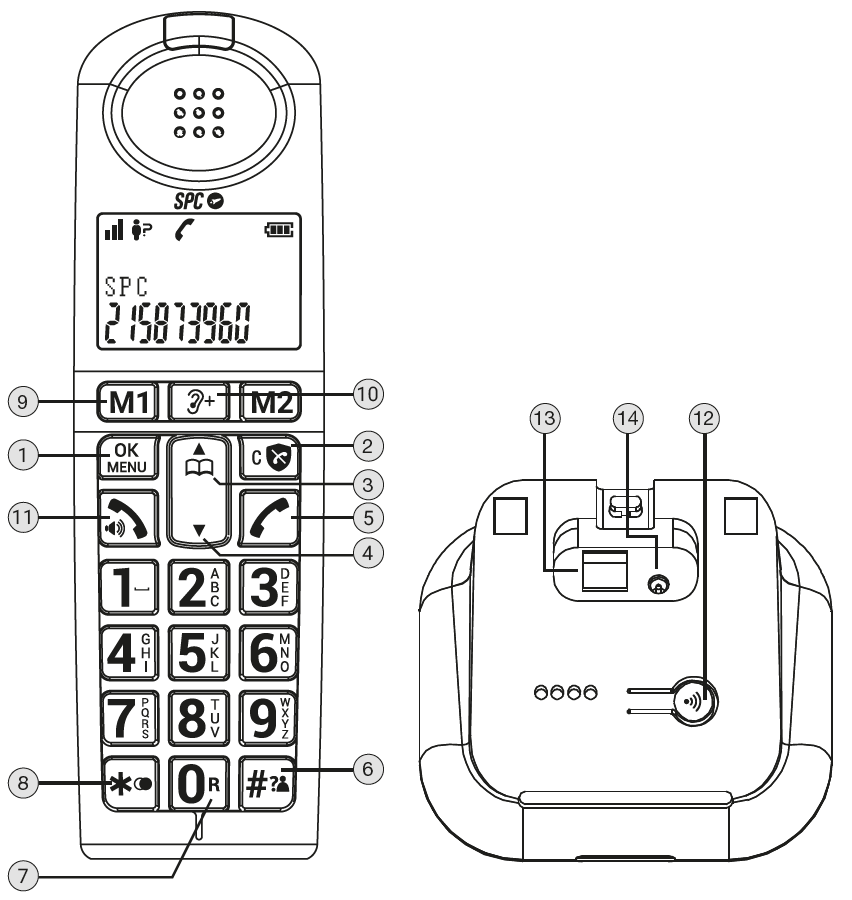 9. Tecla M1, M2: Pulsa para marcar el número pregrabado almacenado.