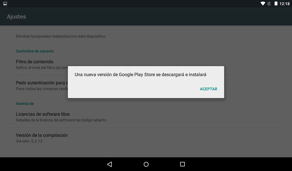 Aparecerá el mensaje que se muestra en la imagen inferior. Pulsa ACEPTAR y la nueva versión se descargará en segundo plano. Espera unos minutos, cuando ya se haya descargado podrás acceder de nuevo a Google Play Store.