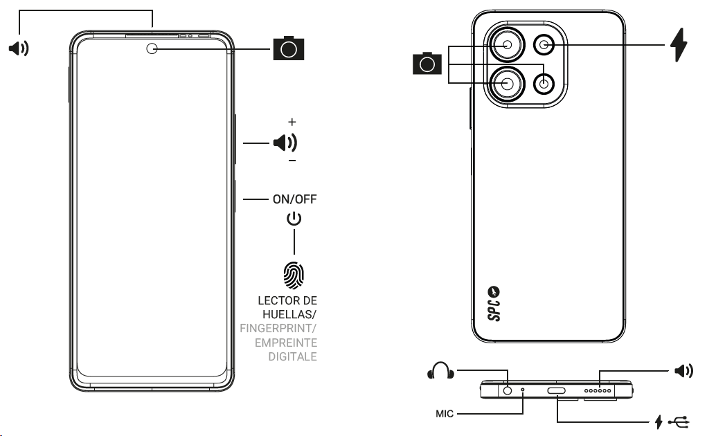 Tu SPC DISCOVERY 2 cuenta con diferentes tipos de controles y conexiones: cámaras, altavoz, micrófono, conexión para auriculares, bandeja para tarjetas SIM o para microSD, botón de encendido y controles de volumen. En la imagen inferior puedes comprobar la localización de todos ellos: