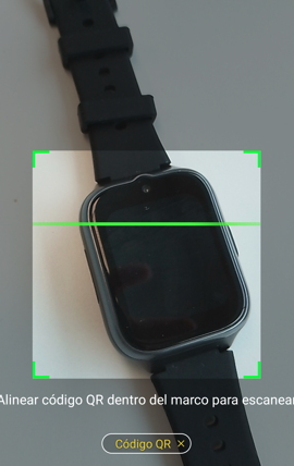 - Posteriormente aparecerá una pantalla que indica cómo encontrar el código asociado al IMEI del reloj, que es necesario para vincularlo. Una vez mostrado el código QR del reloj, selecciona “Se ha encontrado”, se abre la cámara para poder escanearlo. Si no detecta el QR, es posible meter el código a mano, es un código de 10 dígitos y caracteres.