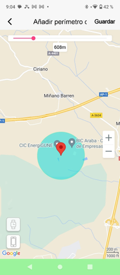 En esta pantalla se define el perímetro de seguridad del reloj. Una vez definido, al superar este perímetro llegará una notificación a los cuidadores avisando de la incidencia.