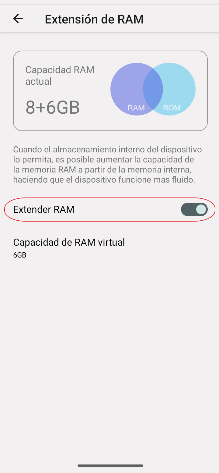 * Puedes desactivar la extensión de RAM virtual cuando quieras accediendo a Ajustes -> Sistema -> Extensión de RAM y desactivando la función (es necesario reiniciar el dispositivo).