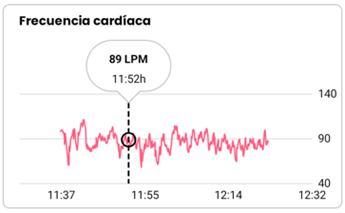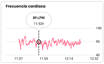 Además, en la pestaña de Día se muestra una gráfica que muestra las variaciones de la frecuencia cardíaca. Pulsando sobre el gráfico puedes acceder al valor de ritmo cardíaco en un instante determinado: