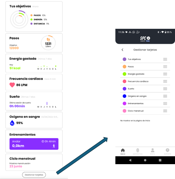 La pantalla INICIO se compone de Tarjetas. Cada Tarjeta es un elemento de información resumida: Objetivos, Pasos, Frecuencia cardíaca… De este modo, de un vistazo puedes ver tu actividad diaria. Y si deseas ver la información detallada, pulsa sobre la tarjeta correspondiente.