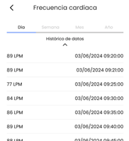 Con la opción “histórico de datos” que aparece al final de las pantallas puedes acceder al listado de últimas mediciones de frecuencia cardíaca: