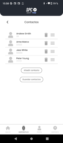 Puedes borrar el contacto pulsando sobre su icono de papelera. También puedes ordenar la lista pulsando sobre las tres barras horizontales del contacto para moverlo a la posición que desees.
