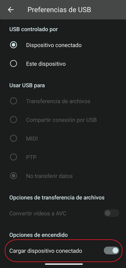 Cuando conectes tu DISCOVERY 3 SE a otro dispositivo que es compatible con esta tecnología, se mostrará una opción adicional en las Preferencias de USB para seleccionar si quieres que sea el DISCOVERY 3 SE el dispositivo que se carga o si quieres que sea el dispositivo que funciona como batería portátil.