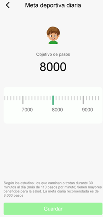 El objetivo de pasos diarios por defecto es de 8000 (cifra diaria recomendada por diversas organizaciones de salud). Pulsando en la parte superior en Ajustes, aparece una barra selectora que permite variar esta cifra a otro valor deseado: