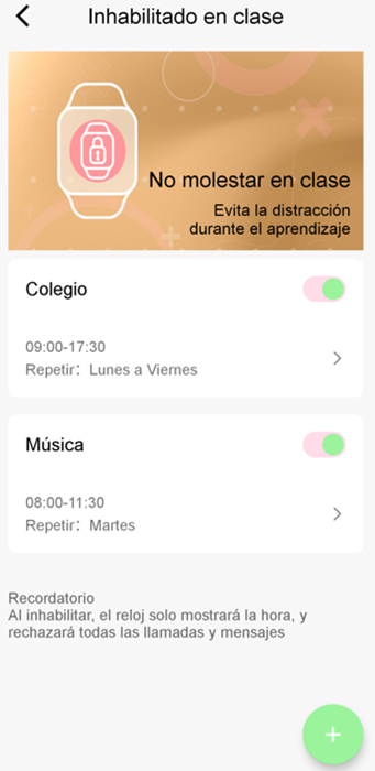 Esta función permite establecer un periodo de tiempo durante el cual el reloj permanece inactivo. De este modo se evitan distracciones durante el aprendizaje.