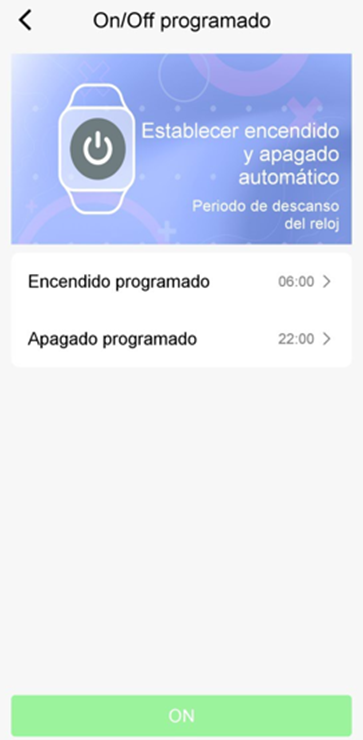 Por defecto está deshabilitado. Para activarla, define la hora y minuto del encendido y apagado, y pulsa sobre el botón ON en la parte inferior. Al activarla, el botón pasará a OFF (el botón significa la acción, no el estado).