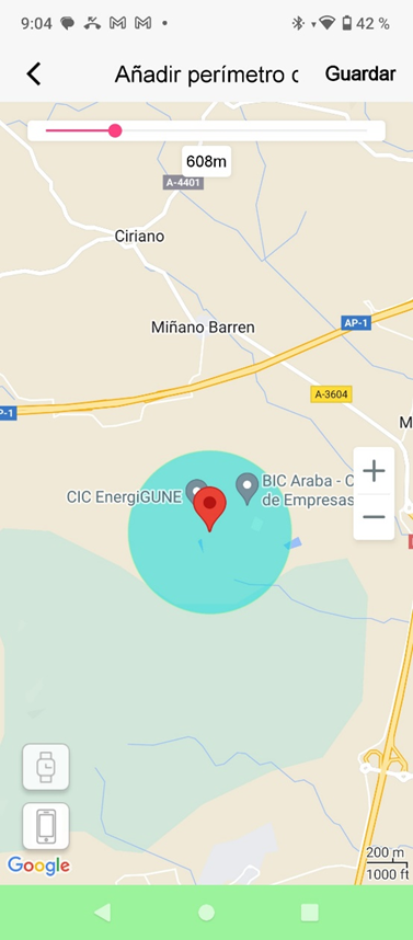 En esta pantalla se define el perímetro de seguridad del reloj. Una vez definido, al superar este perímetro llegará una notificación a los familiares/cuidadores avisando de la incidencia.