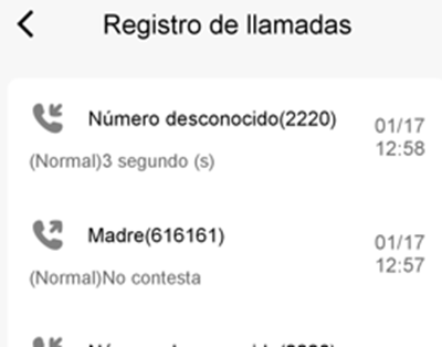 Aparece un listado ordenado cronológicamente con las llamadas recibidas y realizadas, con su duración.