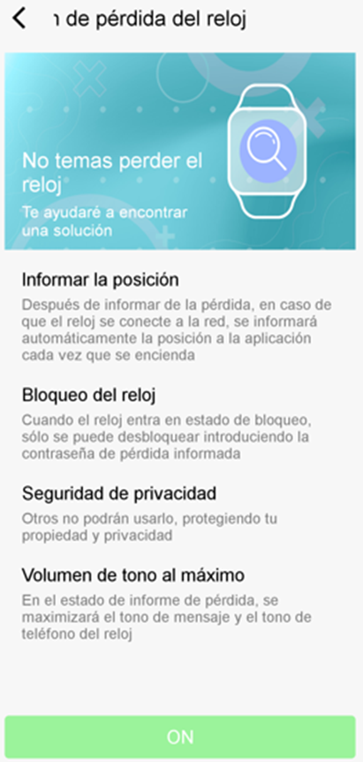 Al desactivar desde la aplicación esta función, se terminará la función de informe de pérdida del reloj y volverá al estado de funcionamiento normal.