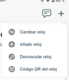 Las funciones “Añadir reloj”, “Desvincular reloj” y “Código QR del reloj” son accesos directos a funciones ya descritas en apartados anteriores.