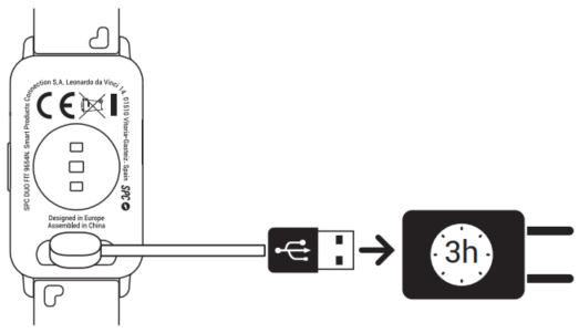 Antes de encender tu reloj por primera vez es conveniente que cargues su batería completamente. Para ello conecta el cable de carga a la parte trasera del equipo y el conector USB a un puerto USB de carga.