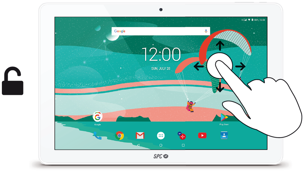 Tu tablet, incorpora por defecto un sistema de desbloqueo muy simple, que consiste en deslizar el dedo por encima como en la siguiente imagen.