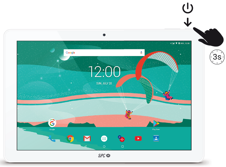 Para encender tu GRAVITY 4G, por favor, pulsa durante 3 segundos en la tecla de encendido que encontrarás en la parte superior derecha de la tablet.